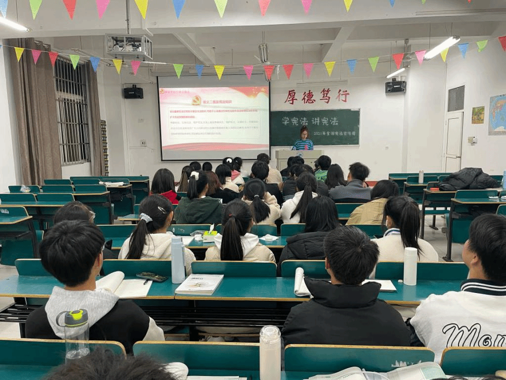 活动中,主讲人从理论出发,讲述了宪法日的时间和由来,阐述了其成立的重大意义。同时,结合相关案列,分析了宪法对于国家繁荣和人民发展的显著作用。最后,呼吁同学们要主动学习宪法知识,尊重宪法、维护宪法、遵守宪法,积极与违反宪法的行为作斗争。