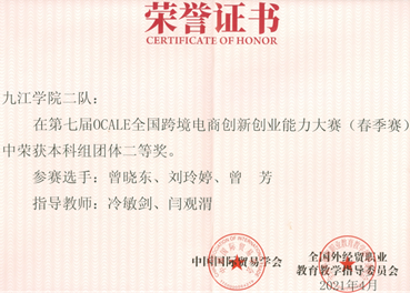 OCALE全国跨境电商创新创业能力大赛中,米兰官网国际经济与贸易专业高聪、柳丽萍、李雯静、曾晓东、刘玲婷、曾芳6名同学组成两支代表队参赛,在冷敏剑、张敏、闫观渭三位老师的精心指导下,米兰milan官方网站二队荣获本科组团队二等奖,米兰milan官方网站一队荣获本科组团队三等奖。