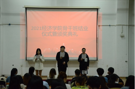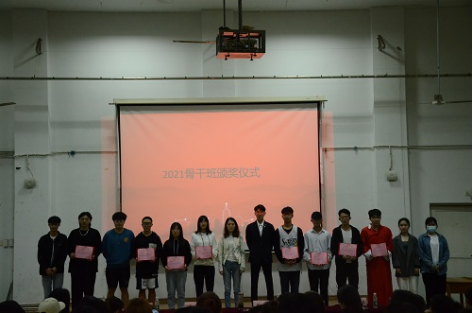 活动伊始,主持人分别就到场嘉宾进行简单介绍。本次活动以活泼青春的舞蹈串烧《good time》开场,诙谐相声《骨干班的日常》绘声绘色地展现了院骨干班成员之间的小趣事。之后,精彩小品《另类农村偶像剧》、《甄嬛后传》等将现场气氛推至高潮;忧郁的粤语歌曲《月光》更显深切情谊。同时,为了纪念建党一百周年,院骨干班成员谢忆艺、梁昊、孙磊以朗诵的形式向在场嘉宾展现出他们作为热血青年的爱国情怀。活动途中,院骨干班成员涂毅、李姝涵上演情景歌舞《shape of you》,精心设计的甜蜜小细节引起喝彩连绵;终极版表情包视频加上GIF图的形式配以形象的背景音乐,台下掌声雷鸣。在欢声笑语后,一段由院骨干班负责人戈畅制作的训练日常视频让在场的院骨干班成员深受感动,泪珠在灯光下闪烁。视频结束,掌声不息。活动进行至末尾,院辅导员陈曦、丁春为优秀院骨干班成员颁发荣誉证书并合影留念。