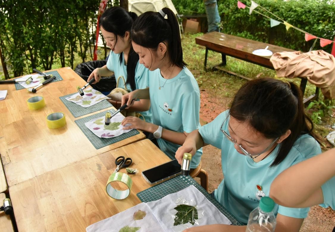 接着,在传承人的指导下,队员们亲自上阵,集体体验了捶草印花的过程。从挑选叶片到敲打印花,每一步都充满了探索的乐趣与创造的喜悦,不仅加深了队员们对非遗技艺的感性认识,更激发了他们对传统手工艺的尊重与保护之心。