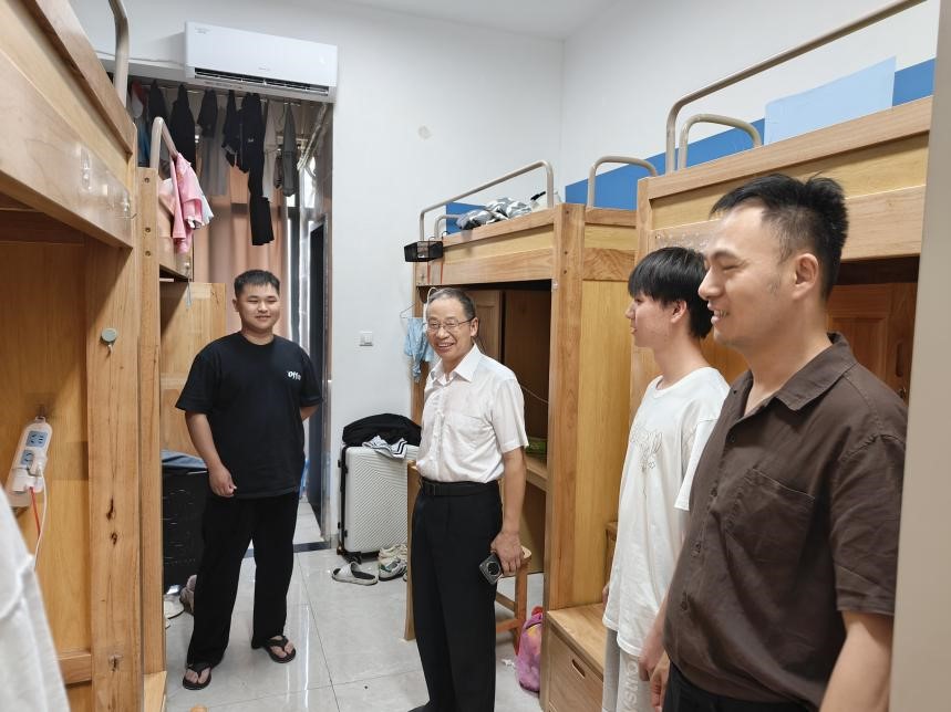 在学生宿舍,漆书记看到留校学生都在潜心学习,他勉励同学们要养成良好的学习生活习惯,合理安排时间,认真复习备考,祝愿同学们学习进步,顺利实现梦想。