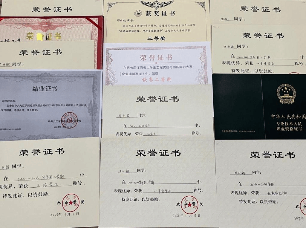 除了在学习和竞赛上的卓越表现,邓升毅还是一位热心公益的志愿者。他积极投身于各类志愿服务活动,用实际行动诠释着爱与责任的真谛。在“庐山杯”马拉松志愿活动中,邓升毅参与了赛道秩序的维护,展现了文明的城市形象。在九江春季防汛救灾演练活动中,邓升毅“以练促防”,切实提升了应急防汛救灾能力。在社区关爱孤寡老人的活动中,他耐心陪伴老人聊天,为他们送去了温暖与关怀。
