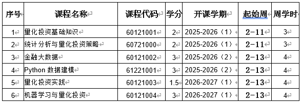 学制1.5年(3个学期),共14.5学分,学生在规定时间内修满培养方案规定的全部课程且考核合格后,可获得米兰milan官方网站《量化投资》微专业学习证明书。