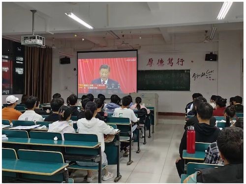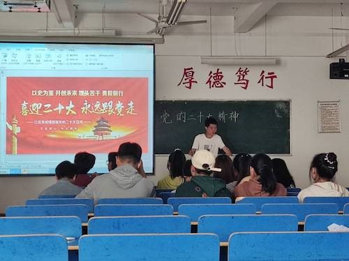 活动中,主讲人组织了同学们观看了党的二十大开幕式,习近平总书记的报告令人振奋。接着,主讲人通过PPT认真讲解了党的二十大精神,并就此谈及二十大对青年学生提出的更高要求,要努力贯彻党的二十大精神的时代任务,以党的二十大精神武装头脑、指导实践。最后,呼吁各班同学积极宣传党的二十大精神,为加强同学们政治素质修养提供强劲引擎。同学们纷纷表示会坚持贯彻二十大精神,为社会主义事业奋斗终身。