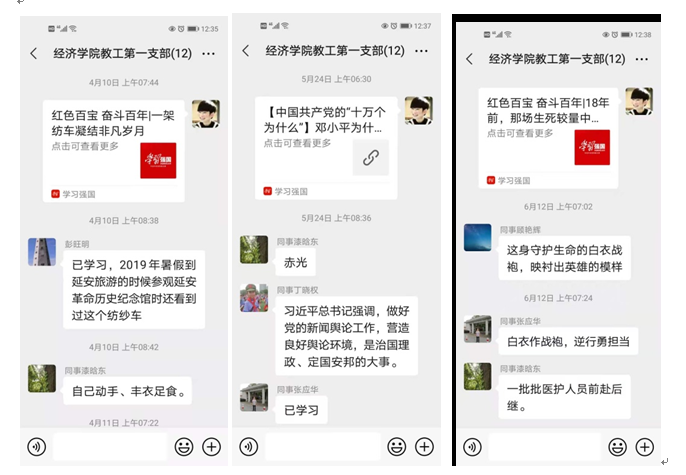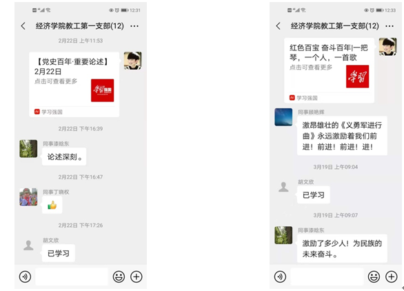 听完习近平总书记的讲话,米兰milan官方网站教工一支部积极想办法,除了利用召开支部大会的机会统一学习之外,大家一致认为可以采用微信形式,每天学习一篇党史知识。