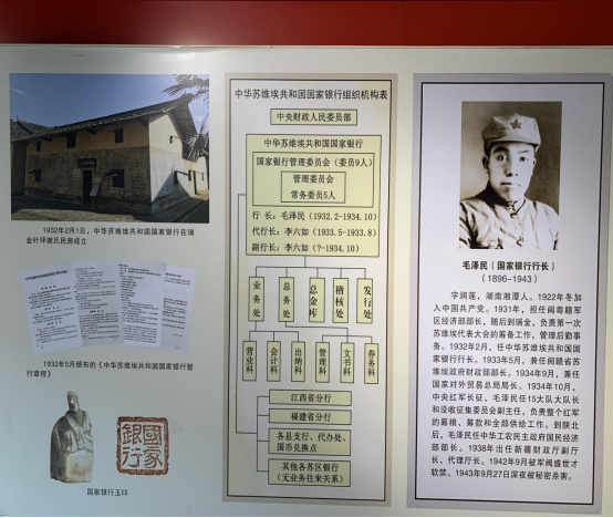 1932年2月1日,中华苏维埃共和国国家银行在江西瑞金叶坪创立,行长毛泽民。此外,苏维埃国家银行还有4名工作人员:业务处长曹菊如,会计钱希钧,出纳1人,勤务员1人兼管兑换,协助出纳工作。苏维埃国家银行条件异常艰苦,行址设在叶坪村一幢砖木结构的两层普通民房里。楼上楼下两个小厅和三个房间,用作营业室、办公室、库房和卧室。
